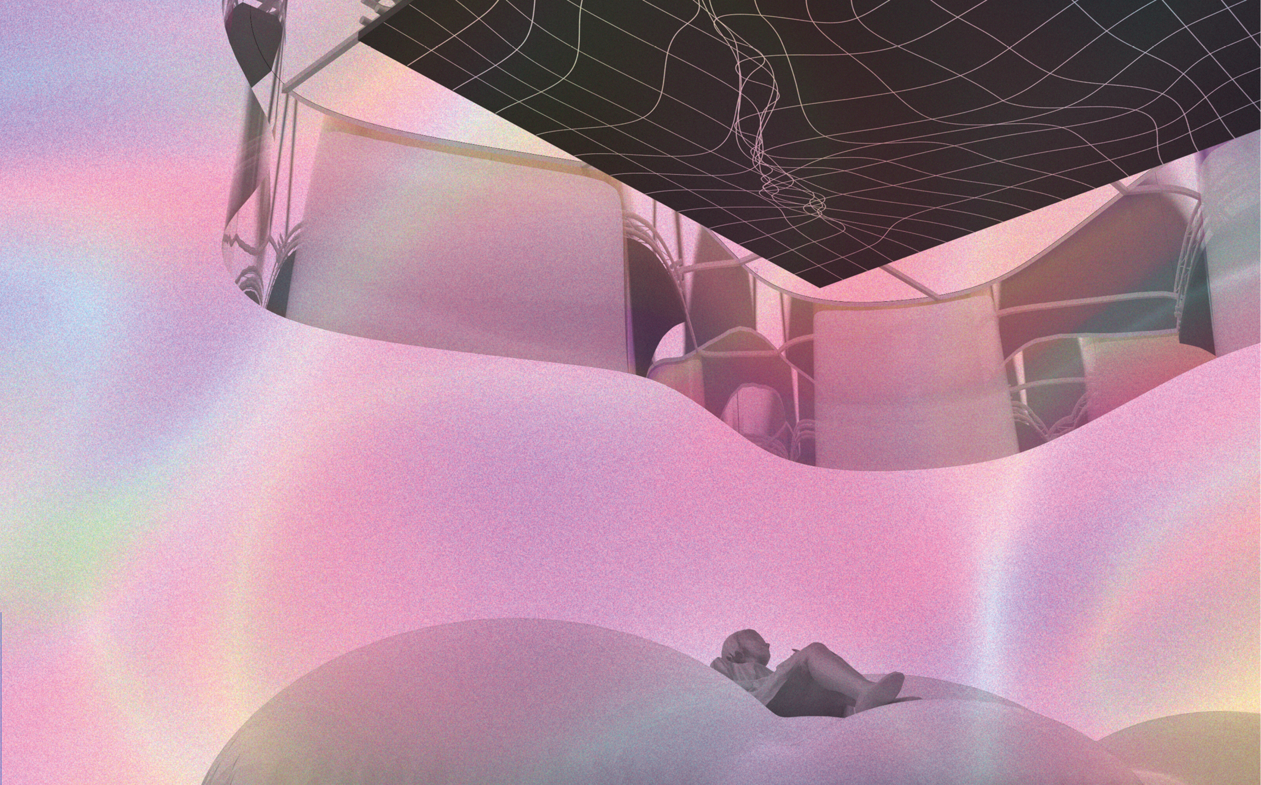 Die Videoarbeit von IRIS-A-MAZ verwandelt das Foyer der Kinemathek Karlsruhe in ein raumbildendes Fries, das Sturz und Übergang zwischen Zuständen thematisiert und Elemente der Renaissance mit zeitgenössischer Medienkunst verbindet.