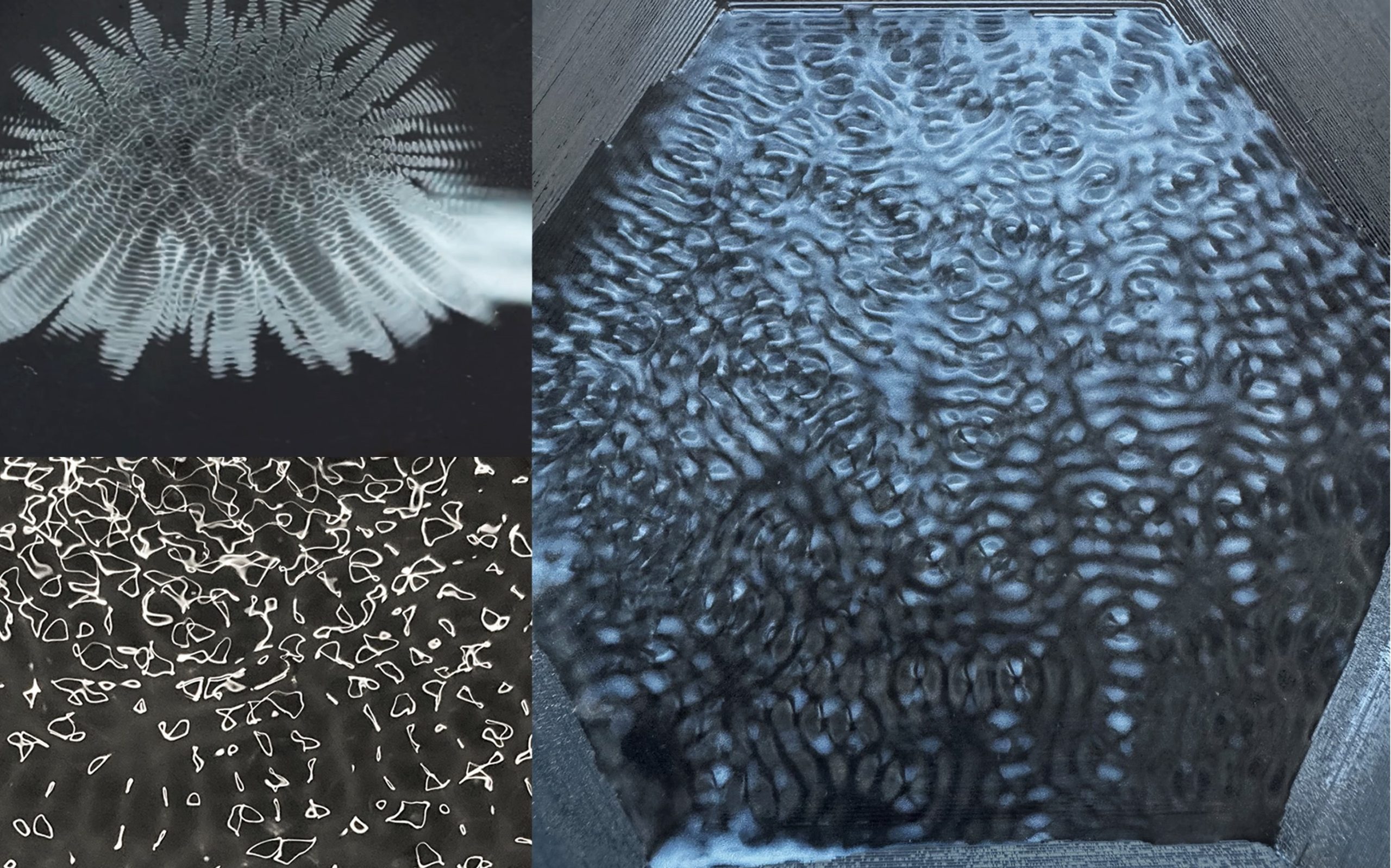 In der interaktiven Installation von Chiharu Koda und Sierk Schmalzriedt entstehen durch vibrierende Wasserschalen eindrucksvolle Muster, die beim Opening am 26. Juni im studio hö live bespielt werden – ein Zusammenspiel aus Frequenz, Resonanz und Bild.