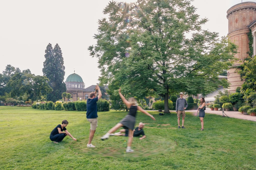 Lawn Centrifuge ist eine Fusion aus kinetischer Erdkunst, astrobotanischer Forschung und Elementen eines grünen Vergnügungsparks. Die Arbeit ist inspiriert von litauischen Wissenschaftlern, die in den 1980er Jahren die Astrobotanik revolutionierten, indem sie eine Pflanze im Weltall erfolgreich vom Samen bis zur neuen Saat züchteten. Das Projekt regt zur Reflexion über die Komplexität der Gartenarbeit im All und den ständig wechselnden Boden unter unseren Füßen an. Es weckt nicht nur ein Gefühl der Desorientierung, sondern hinterfragt auch unsere Wahrnehmung eines stabilen Horizonts. Traditionelle Wahrnehmungsweisen werden obsolet, unser Gleichgewichtssinn gestört. Die Horizontlinie wirbelt, überschwappt und zerstört die modernistischen Konstrukte von Subjekt und Objekt, Zeit und Raum sowie von Natur, Kultur und Technologie.