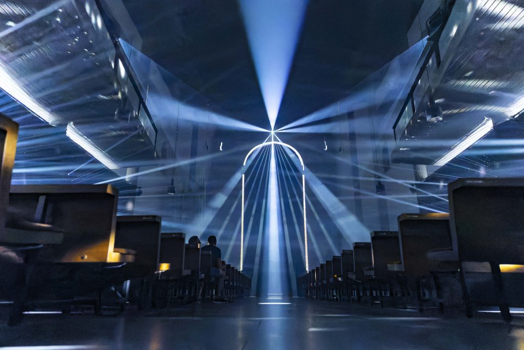 Stellar Sanctuary is a walk-in light installation inside the Evangelical City Church. Inspired by sunbeams in the morning mist and concert lights cutting through fog, it creates a space of floating light – visible, almost tangible, yet elusive.
